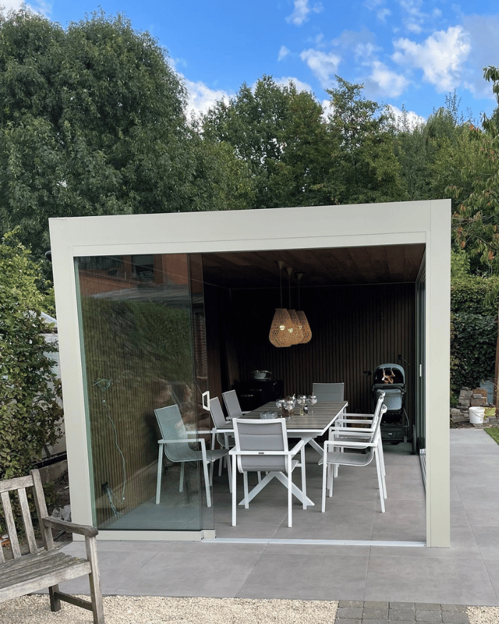 De keuze viel op een strakke aluminium lounge met warme houten achterwand en volledig open te schuiven glazen wanden. Zo blijft alles niet alleen licht en open, maar ook comfortabel beschut wanneer nodig.